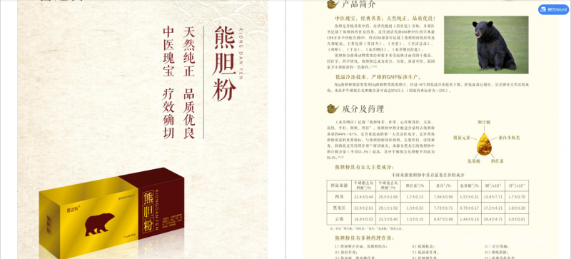 | 性状 | 本品成分为黑熊胆汁经干燥而成的粉末 |